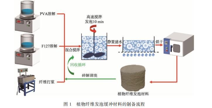 将375 g木纤维浆板泡入23 L去离子水中12 h,使用瓦力打浆机细化30 min,得到打浆度(°SR)为20的阔叶木纤维。将纤维与PVA、F127按不同比例混合,加入去离子水形成悬浮液。将悬浮液在5000 r/min下高速分散10 min,随后倒入带有100目筛网的模具中排水12 h,脱模后在100℃干燥12 h,获得植物纤维发泡材料。