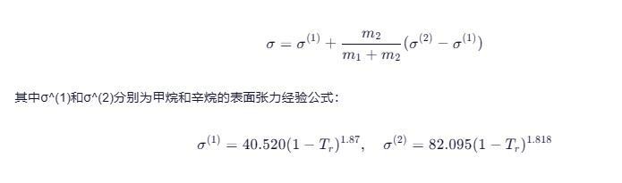 其中σ^(1)和σ^(2)分别为甲烷和辛烷的表面张力经验公式: