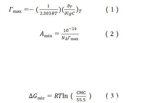 根据表面张力和浓度的关系曲线,使用吉布斯吸附等温线〔方程(1)〕计算出表面活性剂分子吸附在气液界面的最大表面过剩浓度(Гmax)。