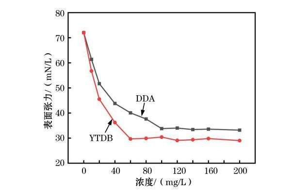 图6显示了DDA与YTDB在石英矿浆中的表面张力。由图6可知,随着捕收剂浓度增大,液体的表面张力均逐渐降低。在DDA捕收体系中,当浓度增加到100 mg/L时,液体的表面张力开始趋于稳定,再增加DDA浓度,表面张力变化不大。故DDA体系下,液体的最低表面张力约为33.79 mN/m,临界胶束浓度为100 mg/L;在YTDB捕收体系中,当浓度增加到60 mg/L时,液体的表面张力开始趋于稳定,再增加YTDB浓度,表面张力变化不大。故YTDB体系下,液体的最低表面张力约为29.67 mN/m,临界胶束浓度为60 mg/L.综上所述,从表面张力来看,YTDB形成胶束和降低表面张力能力更强,疏水性更好,捕收能力更强。