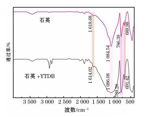 图5显示了石英与YTDB作用前后的红外光谱图谱。对比石英的红外图谱可以看出,出现了图4中YTDB中含有的N—H伸缩振动峰、—CH₂—伸缩振动峰以及—NH₂弯曲振动吸收峰,说明YTDB已在石英表面发生了吸附作用。1084.54 cm⁻¹处Si—O—Si反对称伸缩振动吸收峰蓝移至1086.08 cm⁻¹;786.39 cm⁻¹处Si—O键对称伸缩振动吸收峰红移至789.26 cm⁻¹处。然而,发生作用的图谱中并未有新的峰产生,这表明YTDB与石英之间产生的吸附作用为物理吸附。1618.68 cm⁻¹处—OH的反对称伸缩振动吸收峰红移至1614.02 cm⁻¹,这可能是由于药剂所含有的—OH或—NH与石英表面产生氢键作用。综上所述,石英与YTDB之间发生了物理吸附与氢键吸附作用。