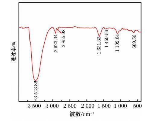图4显示了YTDB的红外光谱测试结果。由图4可知,3513.86 cm⁻¹处出现了一处弱宽峰,是N—H伸缩振动峰;2923.34 cm⁻¹出现的弱峰以及2855.98 cm⁻¹处出现的弱峰分别是—CH₂—对称伸缩振动峰以及非对称伸缩振动峰;1631.33 cm⁻¹处和1459.56 cm⁻¹处出现的两个峰,均为—NH₂弯曲振动吸收峰;1102.64 cm⁻¹处出现了一个弱宽峰,是C—N伸缩振动吸收峰。