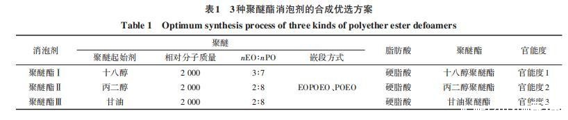 以不同官能度(1、2和3)的聚醚和脂肪酸为原料合成的聚醚酯为消泡剂,表征了其官能团结构,并测定了聚醚酯溶液的表面张力,着重探讨了不同官能度聚醚酯的消泡性能。