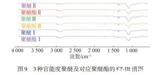 图9为3种官能度的聚醚和聚醚酯FT-IR谱图。由图9可以看出,在3种官能度聚醚的FT-IR谱图中,1 737 cm⁻¹处均无特征峰,而3种官能度聚醚酯在1 737 cm⁻¹处均有特征峰,为酯基C==O的吸收峰,说明3种官能度聚醚末端的醇羟基已经与脂肪酸发生反应。2 971 cm⁻¹处的特征峰表明有—CH₃存在,2 857和1 455 cm⁻¹处的特征峰表明存在—CH₂—,1 296 cm⁻¹处的特征峰则为—CH₃的弯曲振动峰,在1 097 cm⁻¹处的C—O—C伸缩振动峰较明显,表明聚醚酯中醚键较多。