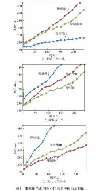 表2为不同种类白水的主要起泡组分,图7为3种聚醚酯消泡剂在生活用纸白水、箱纸板白水和文化用纸白水中的消泡性能。由表2可知,不同种类白水的起泡组分存在明显差异,因此本研究分别讨论不同种类白水中,不同聚醚酯消泡剂的消泡性能。