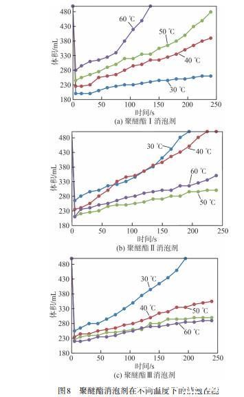 图8为聚醚酯消泡剂在不同温度下的消泡性能。