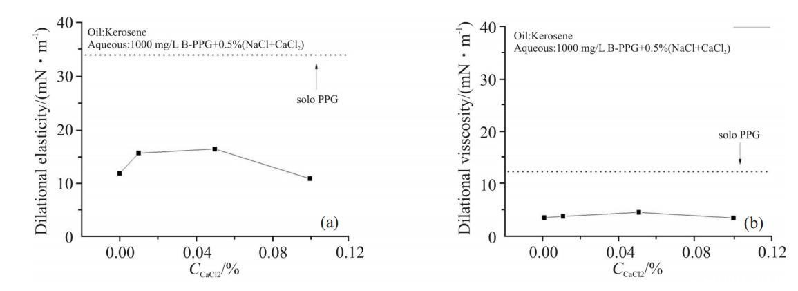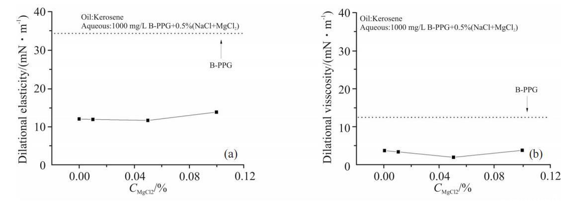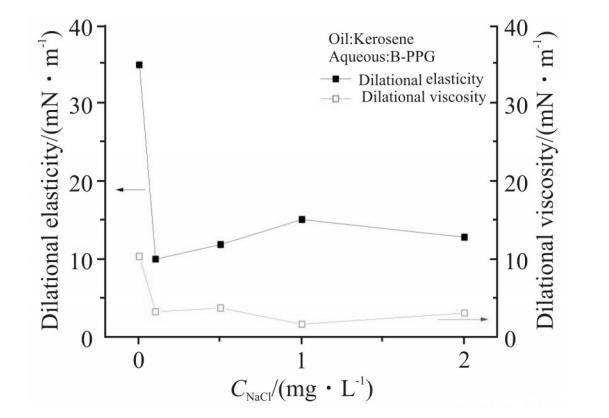 Fig.4为NaCl浓度对1000mg/L的B-PPG溶液界面扩张参数的影响。由图可知,加入NaCl后,体系的界面扩张弹性和扩张黏性都明显下降,扩张弹性降低超过了20mN/m,扩张黏性也由10mN/m左右下降到了5mN/m左右。