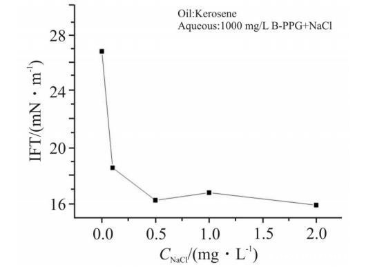 界面扩张弹性主要由B-PPG分子间的相互作用决定,加入0.1%NaCl后,分子间的静电相互作用明显减弱,弹性急剧降低;随着NaCl浓度进一步增大,弹性略有升高,这是由于电解质同时也能够促进界面膜的紧密排列造成的。不过,在上述2种趋势相反的影响因素中,电解质压缩双电层的机制居于主导地位。