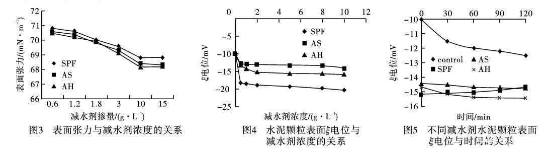 1)SPF对水泥颗粒表面电位的影响ξ电位表示水泥颗粒间静电排斥力的大小。ξ电位越大水泥颗粒间的静电斥力越大,减水剂分散作用越强。掺加不同浓度SPF、AS和AH的水泥悬浮体系的ξ电位,如图4所示。