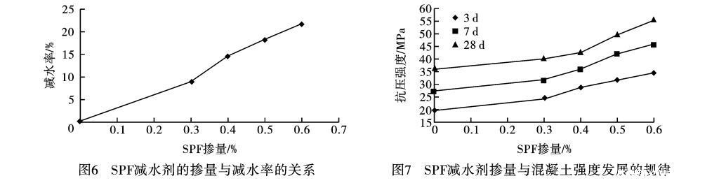 c.SPF高效减水剂应用性能研究表明,随着掺量的增大,减水率有成比例增加的趋势,低掺量下即具有较强的减水分散效果,继续增加掺量后减水率处于平缓状态。掺加SPF高效减水剂对混凝土有明显的增强作用,随着减水剂掺量的增加,不同龄期的抗压强度都在增加,同时混凝土早期强度发展很快,3d的强度可达到28d强度的60%—70%,7d强度可达到28d强度的80%—90%,混凝土后期强度也有增长的趋势。