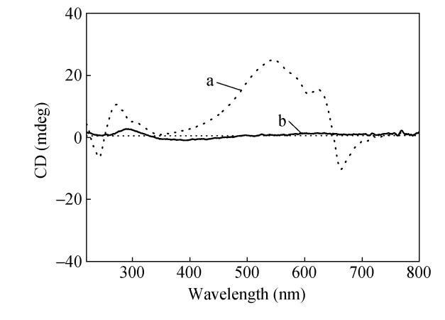 香豆素基团在紫外光照条件下可发生可逆的光二聚反应:在365nm光辐照下,香豆素基团能发生光二聚反应,在254nm辐照下香豆素二聚体能可逆地发生解二聚反应。可以预见香豆素端基的二聚化将影响香豆素取代二乙炔单体在气液界面的组装,从而影响聚二乙炔主链螺旋结构的形成。我们用365nm紫外灯辐照CODA氯仿溶液20min,此时香豆素端基能发生二聚,而二乙炔基团不会发生聚合。将得到的CODA二聚体的氯仿溶液铺展在水面上,沉积制备LB膜,制备得到的CODA二聚体LB膜能聚合成蓝相。CD光谱测试发现香豆素基团和相应的聚二乙炔吸收带均出现了明显的CD信号,但强度较CODA LB膜均有所减弱,如图8所示。