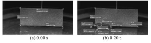 以铂金板浸入至1%和25%氨水溶液的瞬时浸润过程为例(见图1、图2),铂金板底部与水平液面存在一定角度,经HAS-Xviewer Ver软件校准测量,铂金板浸入1%和25%氨水溶液过程中铂金板底部与其倒影夹角分别为2.08,1.37°。