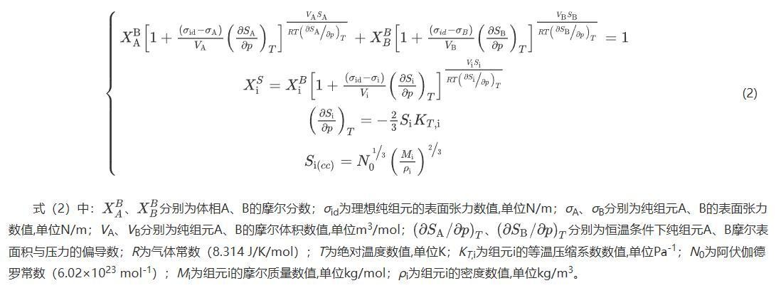 分别为恒温条件下纯组元A、B摩尔表面积与压力的偏导数;R为气体常数(8.314 J/K/mol);T为绝对温度数值,单位K;KT,i为组元i的等温压缩系数数值,单位Pa-1;N0为阿伏伽德罗常数(6.02×1023 mol-1);Mi为组元i的摩尔质量数值,单位kg/mol;ρi为组元i的密度数值,单位kg/m3。