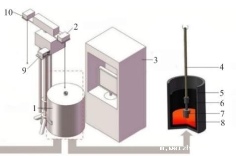 1.高温炉;2.黏度仪;3.控制箱;4.刚玉套管;5.碳化硅坩埚;6.石墨坩埚;7.钨制测头;8.熔盐;9.导电仪;10.天平仪。