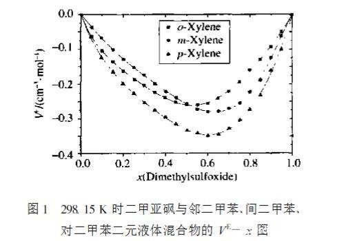 [图1 298.15 K 时二甲亚砜与邻二甲苯、间二甲苯、对二甲苯二元液体混合物的 VE-x 图]