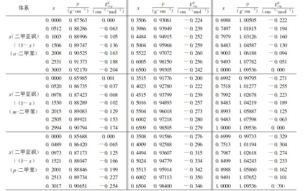 | 体系 | x(二甲亚砜)+(1-x)(o-二甲苯) | x(二甲亚砜)+(1-x)(m-二甲苯) | x(二甲亚砜)+(1-x)(p-二甲苯) | ||||||