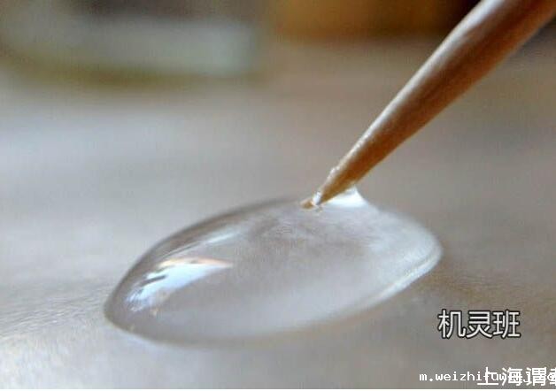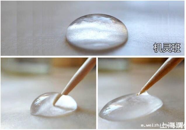 引申实验,在水滴上放置1滴油,把它们混合在一起后,再用干净的牙签戳混合后的液滴,看看此时会发生什么现象。然后用蘸有洗洁精的牙签戳混合后的液滴,看看又会出现什么现象。