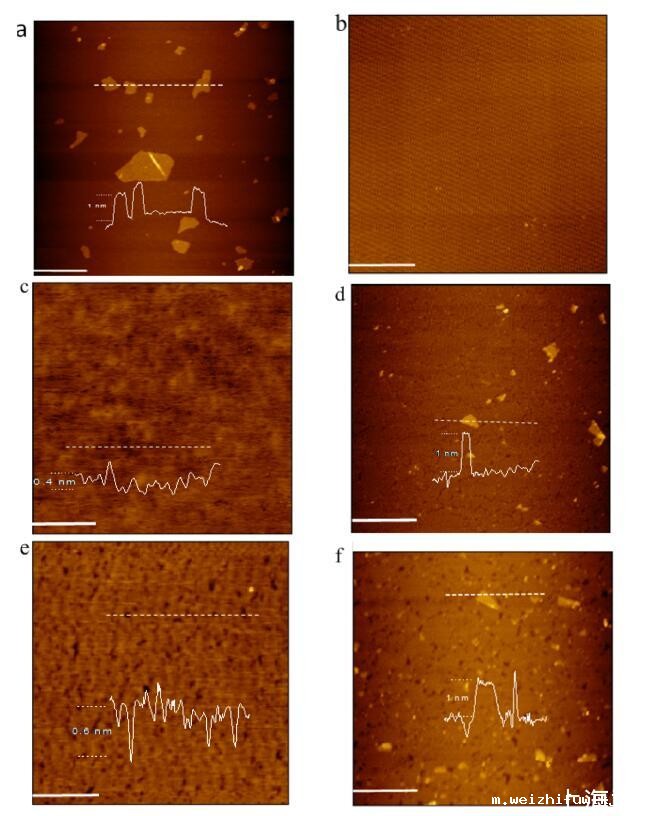 图 5. 新鲜切割的云母表面上的 AFM 图像(比例尺 = 1 μm):(a)干燥后的一滴 GO 分散体; (b) LB的对照实验 在空气-GO 水界面没有脂质沉积的薄膜; (c) 从空气-纯水界面转移的 DODAB LB 薄膜; (d) LB膜 从空气-GO水界面转移的DODAB; (e) 从空气-纯水界面转移的 DSEPC LB 薄膜; (f) LB膜 DSEPC 从空气-GO 水界面转移。 所有脂质 LB 膜都在 20 mN/m 的恒定表面压力下转移。