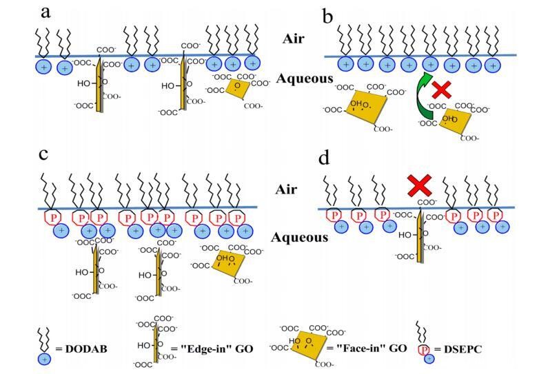 图 3. GO 并入 DODAB (a, b) 和 DSEPC (c, d) 单层时可能取向的示意图 气水界面。
