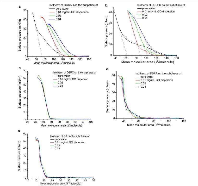 图 1. 空气-水或 GO 分散界面处脂质的表面压力-面积等温线:(a) 带正电荷的 DODAB; (b) 积极 收费 DSEPC; (c) 带中性电荷的 DSPC; (d) 带负电的 DSPA; (e) 带负电的 SA。 请注意,没有表面压力 在空气-GO 分散界面处检测到,而没有在界面处扩散脂质。 每个分子轴面积的虚线的截距 表示每个分子的极限面积。