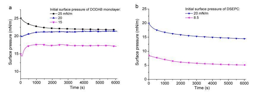 图 4. GO 在不同表面的 (a) DODAB 和 (b) DSEPC 单层的吸附研究(表面压力与经过时间) 压力。 单层首先在纯水亚相上压缩到一定的表面压力,然后 600 μL 1 mg/mL GO 分散体 被小心地缓慢注入单层下方的水亚相中。