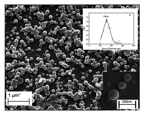 图1显示由纳米粘土(0.05%)和姜黄素纳米颗粒形成的粘土小体组装体的SEM图像。插图(A)显示了粘粒的高斯粒度分布(从SEM图像获得)。发现大多数粘土体(核-壳)颗粒的直径为158±5 nm。插图(B)显示了由纳米粘土壳和壳厚度为40 nm的姜黄素纳米颗粒核形成的单个粘土体。
