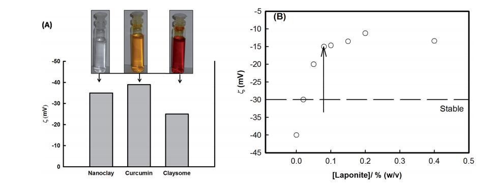 图3(A)描绘姜黄素、纳米粘土和粘土小体的zeta电位的直方图。插图显示了姜黄素在乙醇中的分散,纳米粘土在水中的分散,以及由纳米粘土在无水乙醇环境中稳定的姜黄素纳米颗粒组装而成的粘粒结构(颜色的变化(插图中所示)清楚地表明了姜黄素和纳米粘土之间的相互作用)。(B) 粘土小体组装的zeta电位随纳米粘土浓度的变化。这清楚地表明了在较低浓度的纳米粘土中组装的稳定性。箭头表示粘土成分。