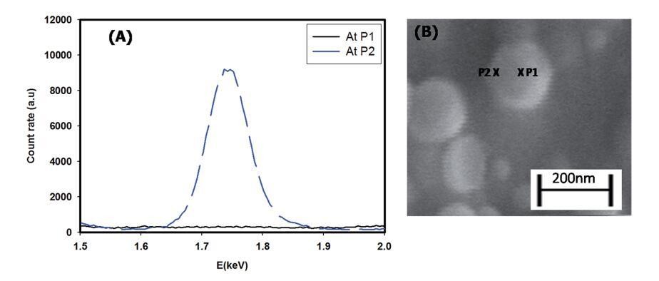 图1显示了核壳颗粒组装的SEM图像。这清楚地显示了直径为158±5 nm的球形颗粒(粒径的高斯分布在插图A中给出),具有暗芯和浅电晕(插图B)。典型的磁芯直径约为100 nm,电晕宽度约为40 nm。通过光散射实验确定了组件的直径。光散射数据分析得出的直径为100–200 nm,最大颗粒数的直径为161±10 nm,这与从SEM数据获得的尺寸一致(从DLS获得的颗粒尺寸的高斯分布在ESI†图S2中给出)。EDAX结果证实了粘土片在组件中的位置。图2(A)和(B)显示了给定结构在两个不同位置(xP1和xP2)的能量色散分布。它们清楚地显示了核心(xP1)内不存在硅(粘土结构中的主要元素之一),以及日冕(xP2)中硅的丰度。33,34这证实了粘土片被排除在这些结构的核心之外。因此,可以得出结论,核心是疏水的,主要含有姜黄素纳米颗粒(姜黄素不溶于水),而外壳(电晕)具有自组装血小板的倾向(LAPONITE®不溶于乙醇)。因此,我们有一个结构,其中的核心是一个有机相(乙醇)周围的水晕。由于其溶解性偏好,姜黄素纳米颗粒和LAPONITE®血小板分别优先位于有机相和水相。