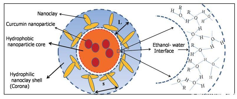 图4示意图显示了在电晕中存在纳米粘土团和限制在疏水核内的疏水姜黄素纳米颗粒的粘土体结构的形成。