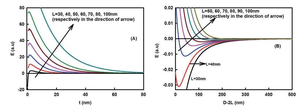 图5纳米粘土簇的长度对粘土小体组装的影响。(A) 作为界面区域厚度函数的能量变化(s¼60 nm;T¼298 K,f¼0.5;姜黄素纳米颗粒半径R¼50 nm,疏水衰减长度x0¼1 nm,界面张力¼40 mN m-1)。(B) 粘粒–粘粒相互作用作为粒间分离D的函数,使用方程(5)计算。当存在大的纳米粘土团簇时,能量最小值的深度减小,当L>80nm时,能量变得完全排斥。