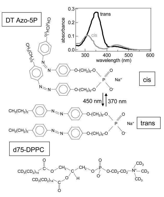 图1。 顺式和反式构型的光开关脂质DT Azo-5P和d75 DPPC的分子结构。 右上角的插图显示了CHCl3中DT Azo-5P的紫外/可见光谱( ∼ 在370nm(顺式状态)和450nm(反式状态)下辐照约10s后,使用7μM,1cm的反应杯。