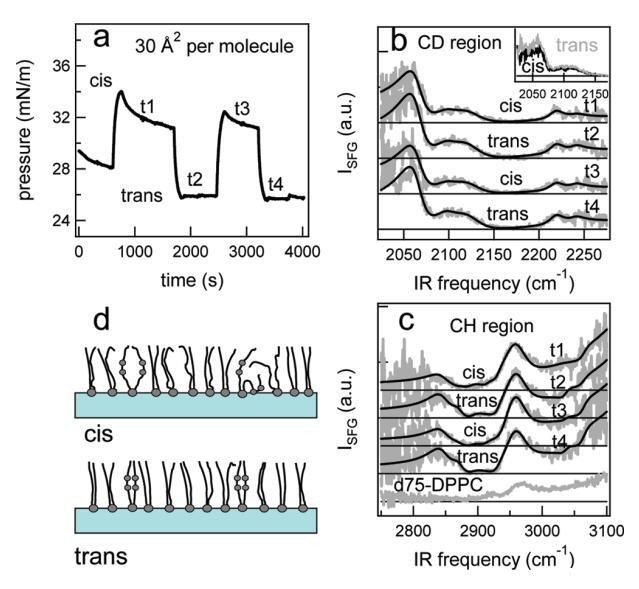 图6。在脂质/H2O界面处,DT Azo-5P/d75 DPPC的1:5混合物的结果,每个分子的面积为60Å2。(a) 表面压力与时间的关系。用370和450 nm光照射∼100秒分别产生顺式(高压)和反式(低压)状态。压力的微小剧烈波动是由于样品高度的变化,以校正水的蒸发。(b) 相应的VSFG光谱(灰色)以及CD区域的拟合。为了清晰起见,光谱已被抵消。(c) VSFG光谱(灰色)以及用于引导眼睛进入CH区域的拟合。底部曲线显示了在P时纯d75 DPPC的光谱∼ 40百万/米。(d) 脂质尾部方向的示意图。光开关脂质的偶氮苯部分用灰色圆圈表示。