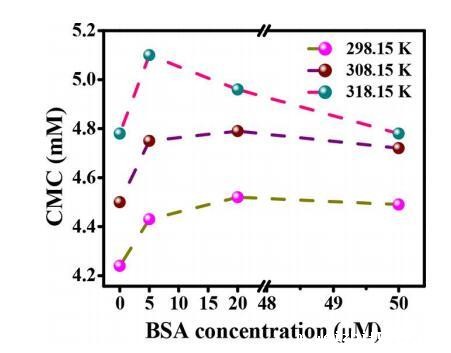 随着BSA浓度的增加,CMC值的增加是由于胶束化所需的[C10-4-C10im]Br2单体的数量减少,因为它们与BSA形成复合物,而不是形成胶束。 这个数字随着BSA浓度的增加而不断增加,因为与BSA结合需要更多的分子。 BSA-[C10-4-C10im]Br2体系的表面张力值低于相应的[C10-4-C10im]Br2体系,这是由于BSA-[C10-4-C10im]Br2络合物具有较高的表面活性。[72]如果我们必须单独分析每种情况,即在固定的BSA浓度下, 观察到CMC值随温度升高而增加,这表明在CMC附近,[C10-4-C10im]Br2与BSA的结合取决于疏水相互作用。[65,73]