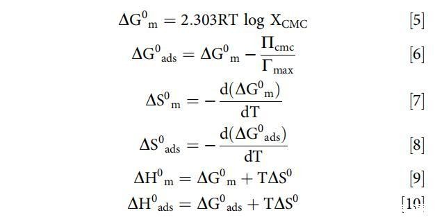 计算了在不同浓度和温度下[C10-4-C10im]Br2在不存在和存在BSA的情况下的胶束化和吸附热力学参数,以确定温度和BSA浓度的升高是否有利于胶束化(本体相浓度)或吸附 [C10-4-C10im]Br2的(界面浓度)。使用以下关系式计算各种热力学参数。[79]