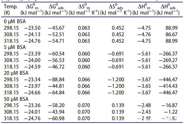 表2. [C10-4-C10im]Br2在不同温度下吸附和胶束化的热力学参数与BSA浓度的关系。