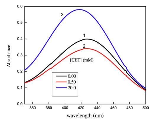 图7.含有不同体积百分比二甘醇-水混合物(1)5 v/v%二甘醇-水(2)10 v/v%二甘醇-水和(3)15 v/v%二甘醇-水的CET/[C10min][Cl]胶束聚集体中含水铬吸收光谱的变化。