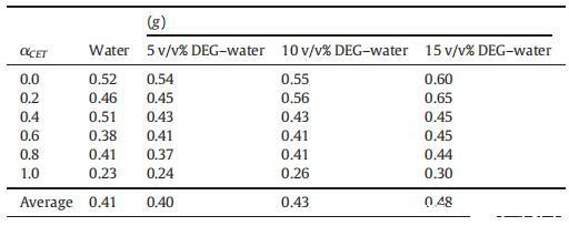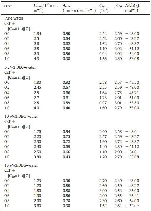 表4纯CET、[C10min][Cl]和CET+[C10min][Cl]混合物的表面过剩(Γmax)、每分子最小面积(Amin)、吸附效率(pC20)和吸附自由能(ΔGad 0),作为纯水中CET摩尔分数α的函数,并且在T=298.15K时存在不同体积百分比的二元DEG-水混合物。