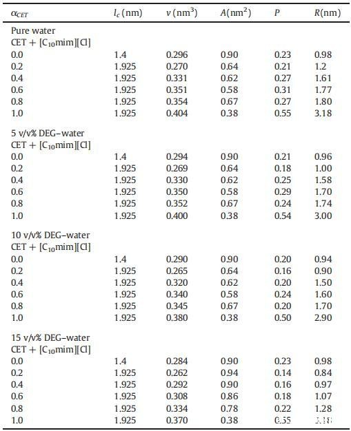 表5在纯水中以及在T=298.15 K下存在不同体积百分比的DEG+水二元混合物时,纯CET、[C10min][Cl]和混合物CET+[C10min][Cl]的有效疏水链长度(lc)、疏水链体积(v)、极性头基团表面积(A)、填充参数(P)和半径(R)的值。