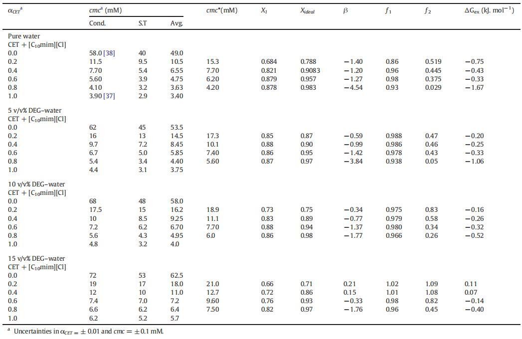 表1(cmc)、平均值(cmc)、理想值(cmc*)、胶束组成(X1,Xideal)、相互作用参数(β)的值,混合物CET+[C10min][Cl]的活度系数(ƒ1,ƒ2)和混合过量自由能(ΔGex),作为纯水中CET摩尔分数(α)的函数,以及在T=298.15 K时DEG-水二元混合物的不同体积百分比。