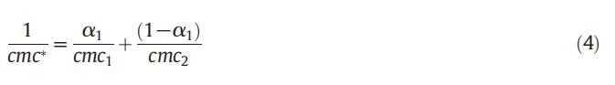 应用伪相模型,我们可以计算二元混合物的理想cmc,该模型基于这样的假设,即胶束被视为宏观相,与溶液中相应的单体处于平衡状态。理想cmc值与单个cmc相关,可使用Clint公式(4)计算: