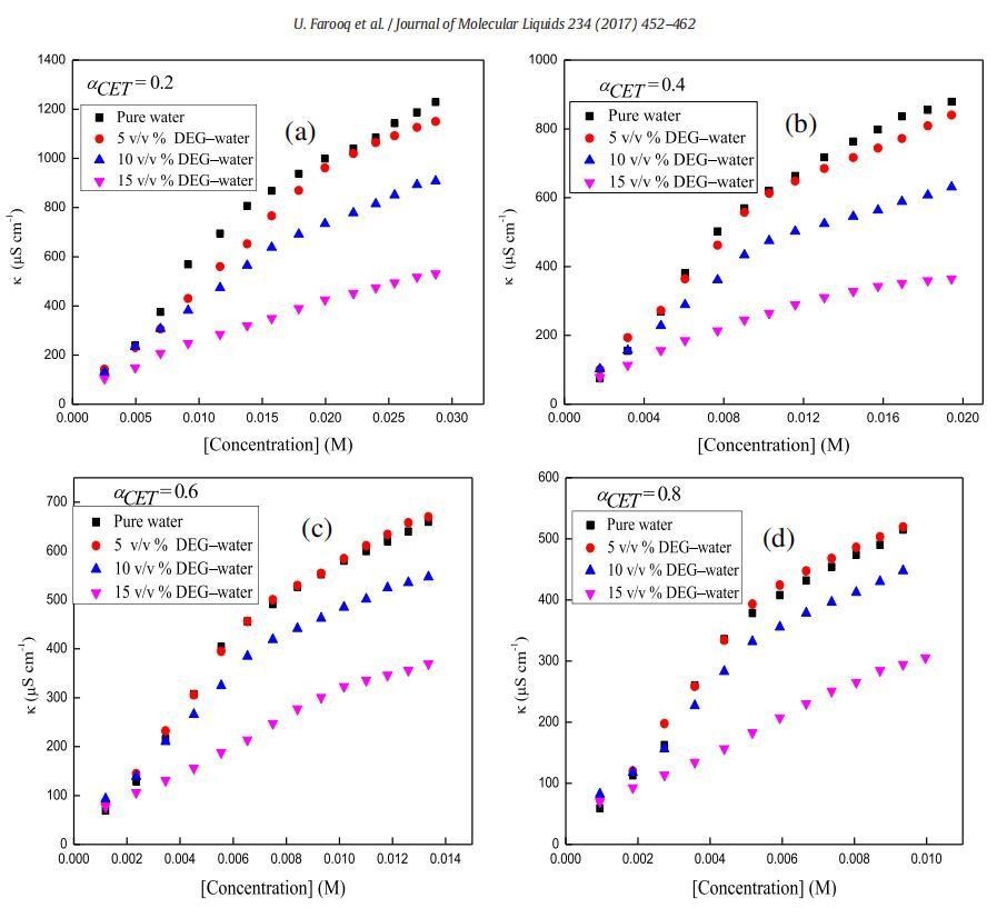 图1。在T=298.15 K时,二甘醇-水二元混合物的不同体积百分比下,混合体系的比电导率,κ与[浓度]的曲线图,CET+[C10min][Cl](a)αCET=0.2(b)αCET=0.4(c)αCET=0.6和(d)αCET=0.8。