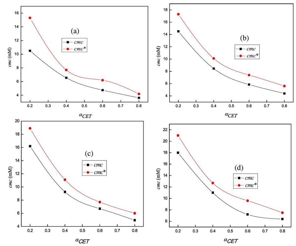 图4。cmc的变化(■)在298.15 K条件下,在不同体积百分比的二甘醇-水混合物(a)存在于纯水中(b)5 v/v%二甘醇-水(c)10 v/v%二甘醇-水和(d)15 v/v%二甘醇-水中时,使用αCET的cmc*()。