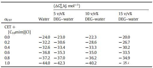 从表2中可以清楚地看出,g值并不遵循特定的趋势,但是随着DEG在混合系统中的体积百分比的增加,其g值以某种方式增加,这种增加可能是因为胶束的表面电荷密度降低,这是由于胶束聚集数减少所致。水和DEG-水二元混合物中CET、[C10min][Cl]和CET+[C10min][Cl]混合胶束的标准吉布斯自由能(ΔGm0)值如表3所示。如表3所示,随着二甘醇与水的体积百分比的增加,胶束化过程变得不那么自发。