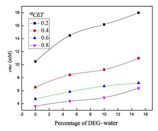 图3。不同DEG-水混合物体积百分比下cmc的变化(a)αCET=0.2(■),(b)在298.15 K时,αCET=0.4(),(c)αCET=0.6()和(d)αCET=0.8()。