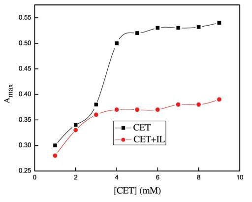 图6.含水铬峰的最大吸光度与[CET]的变化(■)在没有ILs和()的情况下,存在0.05 w/w%的[C10min][Cl]。