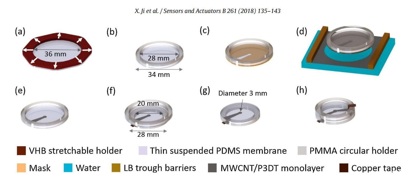 图2。采用LS技术制备1.4μm厚DEA的工艺。(a)悬浮式PDM(Sylgard 186)等双轴预拉伸(初始厚度:2.0μm,拉伸后:1.4μm)。(b)悬浮拉伸1.4μm厚的PDMS膜,固定在PMMA支架上。(c)在悬浮膜上放置一个面罩。(d)在空气-水界面形成的单层电极在带有掩膜的悬浮PDMS膜上的LS转移。(e)PDMS上的图案化单层电极。(f)将覆盖有图案化单层电极的PDMS膜转移到较小的PMMA支架上。(g)图案化单层电极位于PDMS的下侧,电极与铜带连接,PDMS的上侧不带电极。(h)采用LS电极技术制造DEA。