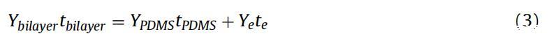 测量裸PDMS膜的杨氏模量后,将单层电极转移到这些PDMS膜上。使用与裸PDMS膜相同的参数测定PDMS+电极双层的杨氏模量。PDMS+电极双层由两个长度和宽度相等的粘附层形成,因此使用[33]计算电极杨氏模量: