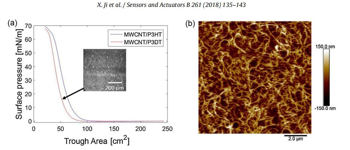 图3。(a)MWCNT/P3HT和MWCNT/P3DT单分子膜的表面压力与槽面积等温线,以及15 mN/m下MWCNT/P3DT单分子膜的BAM图像。(b)15 mN/m下转移到PDMS基底上的MWCNT/P3DT单分子膜的AFM图像。