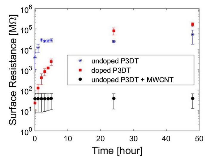 图4。DOPEDP3DT、undopedP3DT和UNDOPEDMWCNT/P3DT单层电极的表面电阻随时间的变化。
