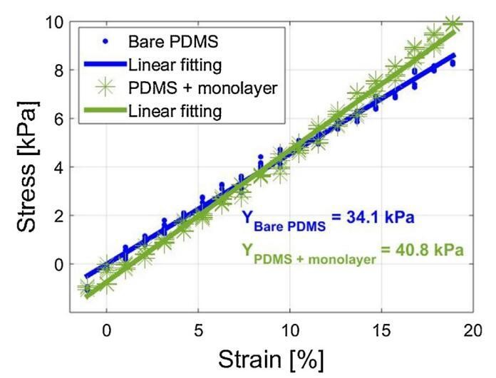 图7。裸PDMS基板和覆盖MWCNT/P3DT单层电极的相同PDMS基板的应力-应变曲线,允许测定单层刚度。